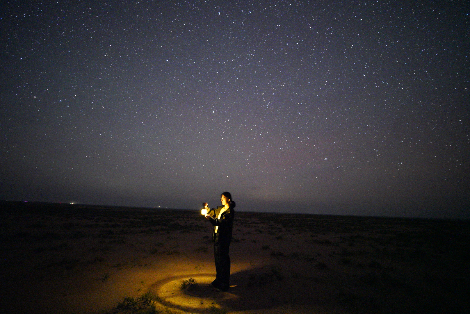 两晚都没赶在日落前落脚,两辆越野车,七个人,顶着星点和新月,找更黑的夜。 闰六月的初二初三,火红落日延伸至道路尽头,而后落在沙丘背面。梦想公路,向西,依着沙丘起起伏伏。 月牙轻轻挂,我们潜行,两旁的腾格里沙丘流动。